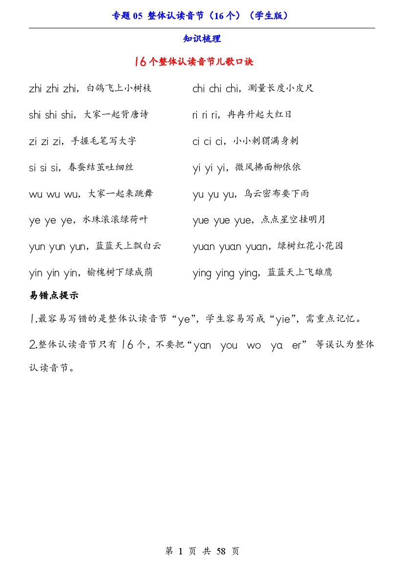 一上语文专题05 整体认读音节(16个)(知识+训练)