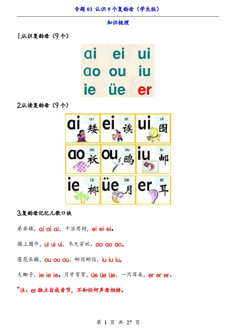 25新【一上语文】拼音专题-专题03 认识9个复韵母(知识+训练)