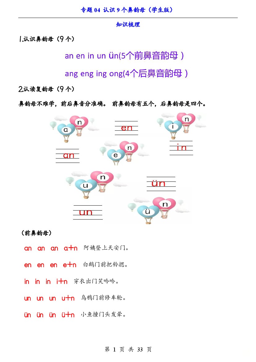 25新【一上语文】拼音专题-专题04 认识9个鼻韵母(知识+训练)