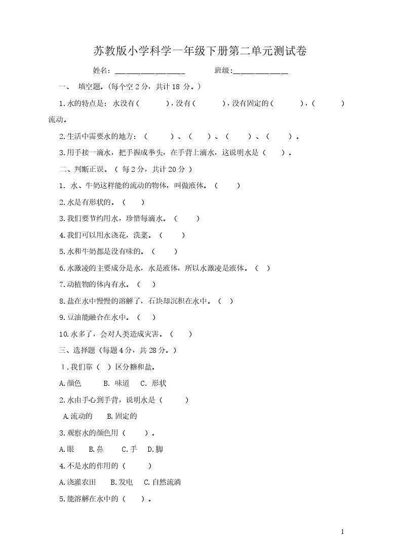 一年级下册科学单元测试卷-第二单元水苏教版(含答案)