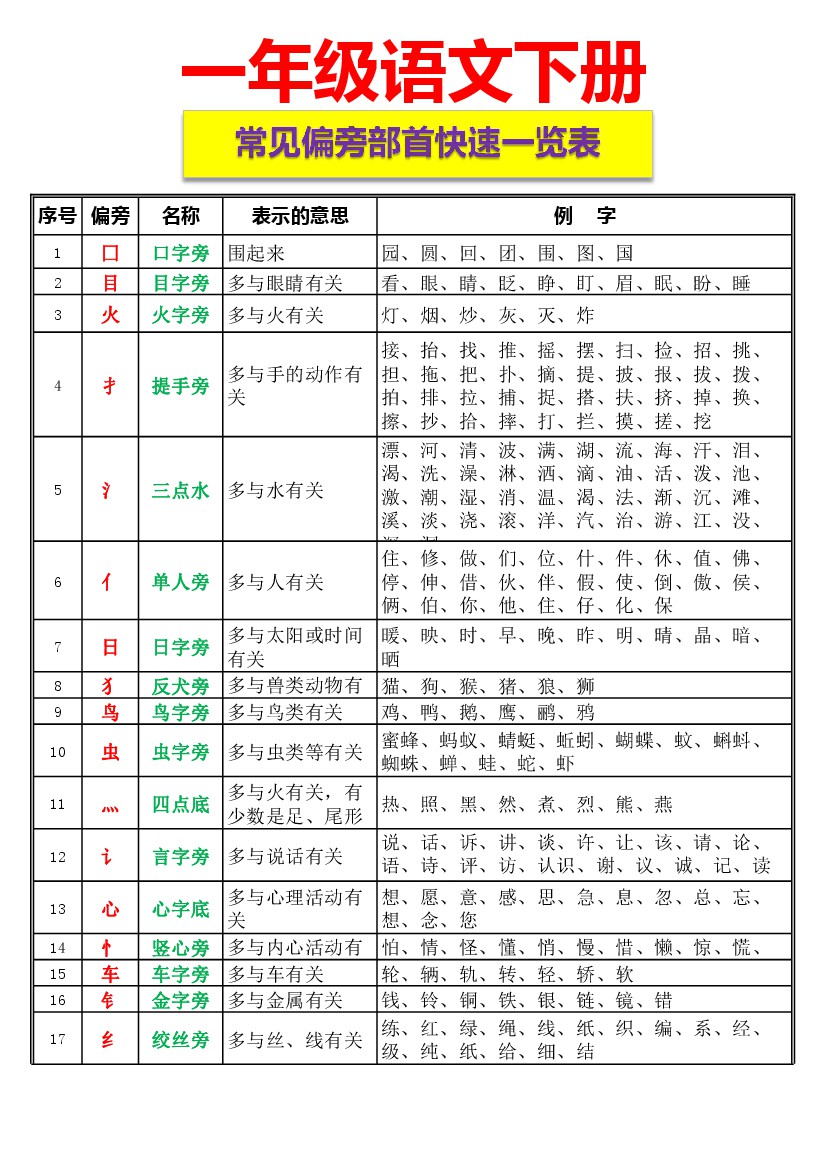 【部首】一年级(下册)资料整理-常见偏旁部首一览表4页