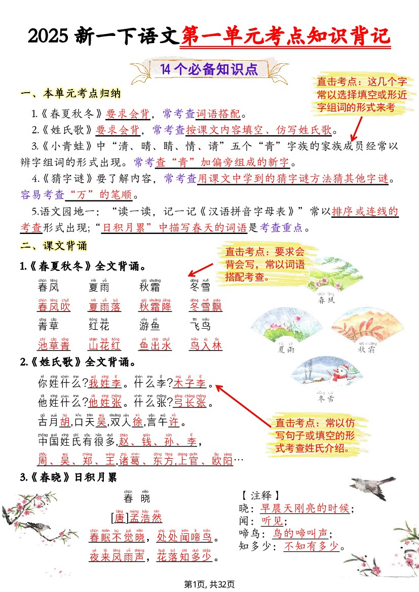 一年级(下)语文1-8单元考点知识背记