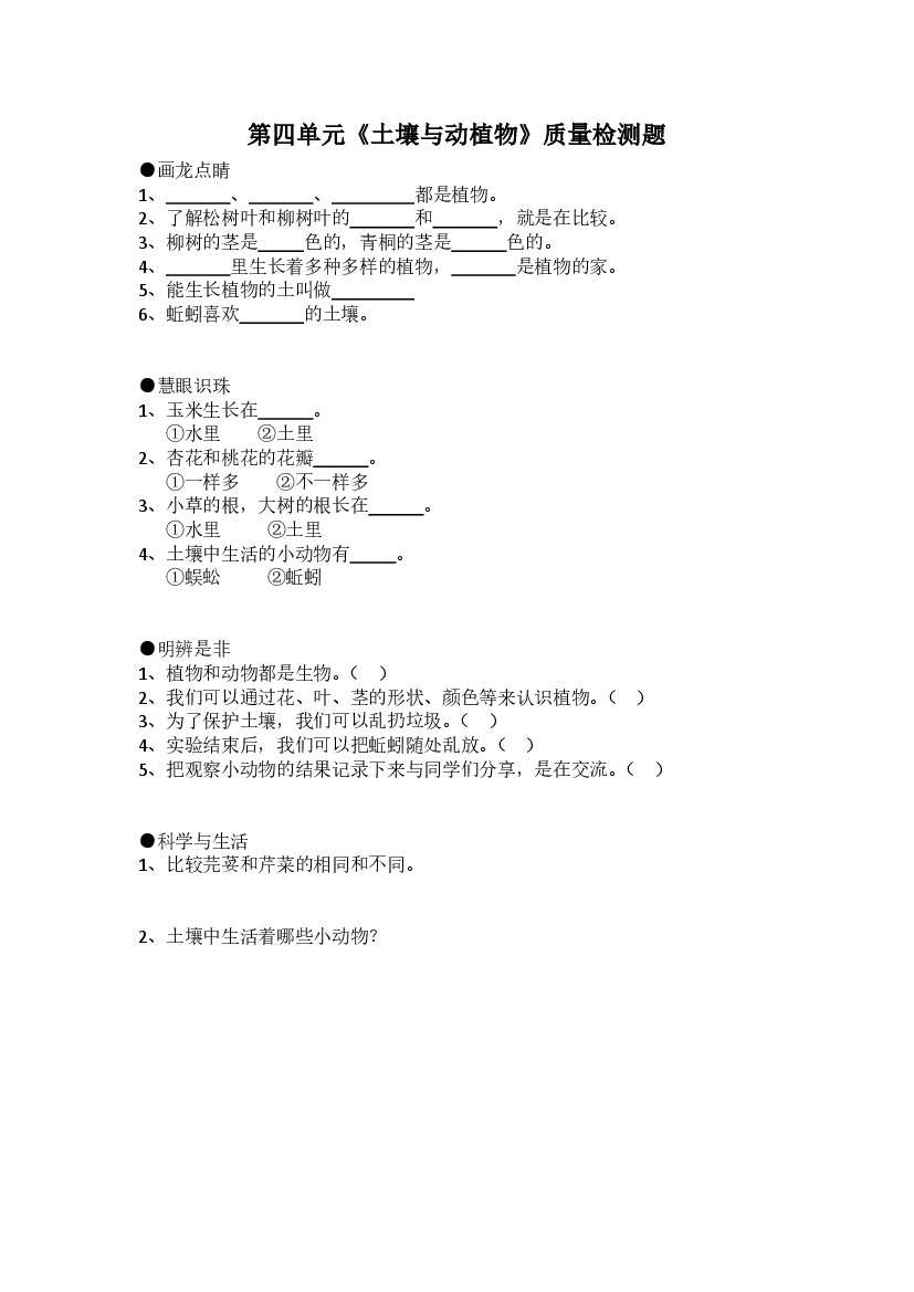 一年级下册科学试题第四单元青岛版(六年制)有答案
