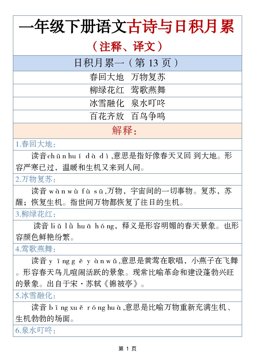 【日积月累】一年级下册语文古诗与日积月累(注释、译文12页)