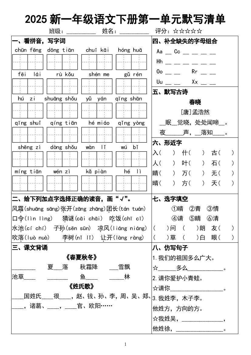 统编版2025学年小学一年级语文下册期末综合测试卷