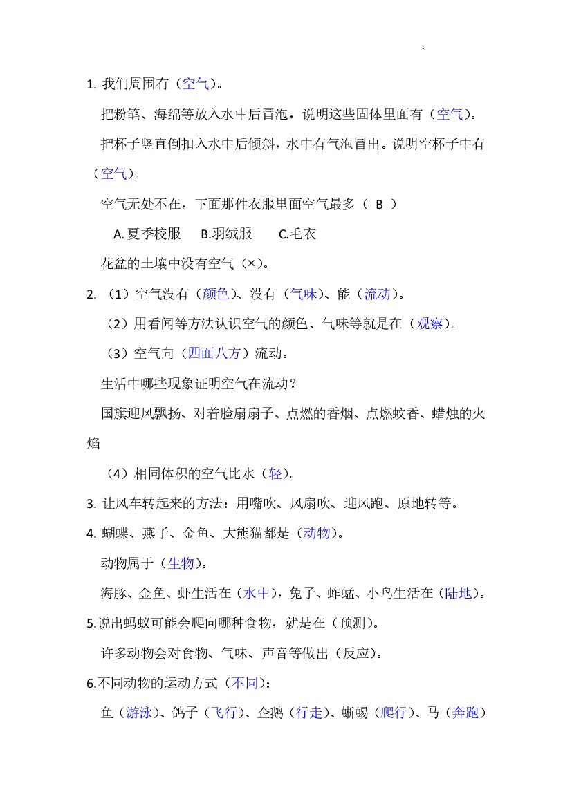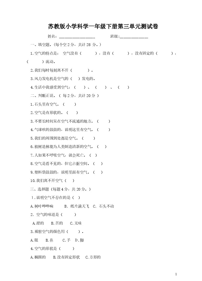 一年级下册科学单元测试卷-第三单元空气苏教版(含答案)