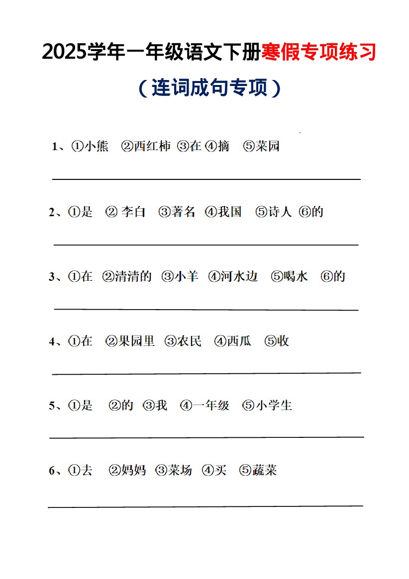 【连词成句】25春一年级语文下册连词成句(练习+答案)26页