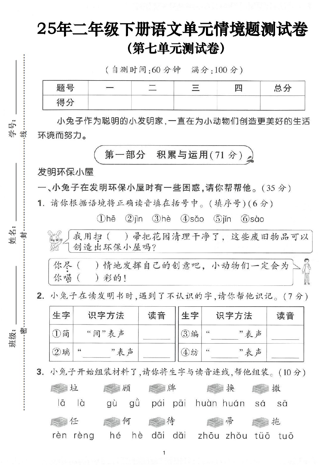 2570【25年二下语文第七单元情景测试卷(含答案5页)