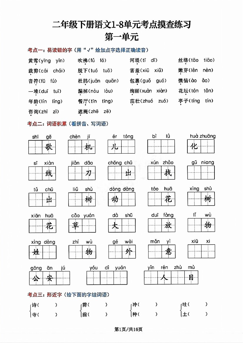 二年级(下)语文单元考点摸查练习
