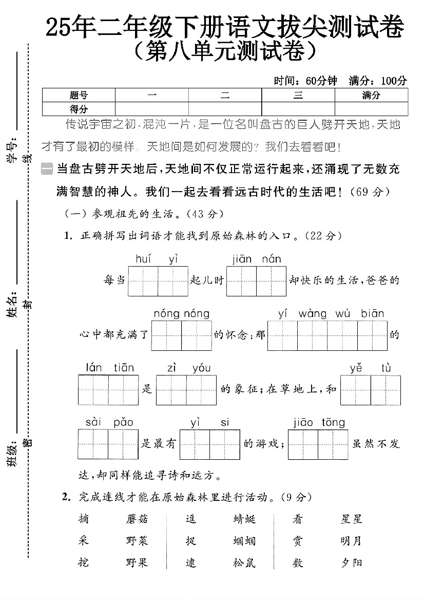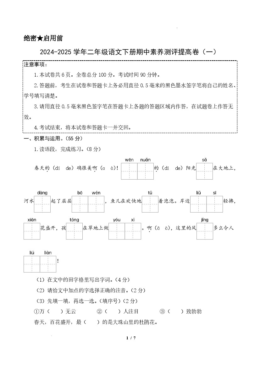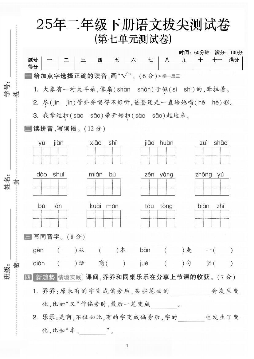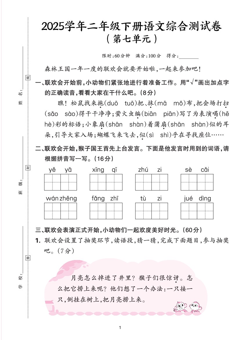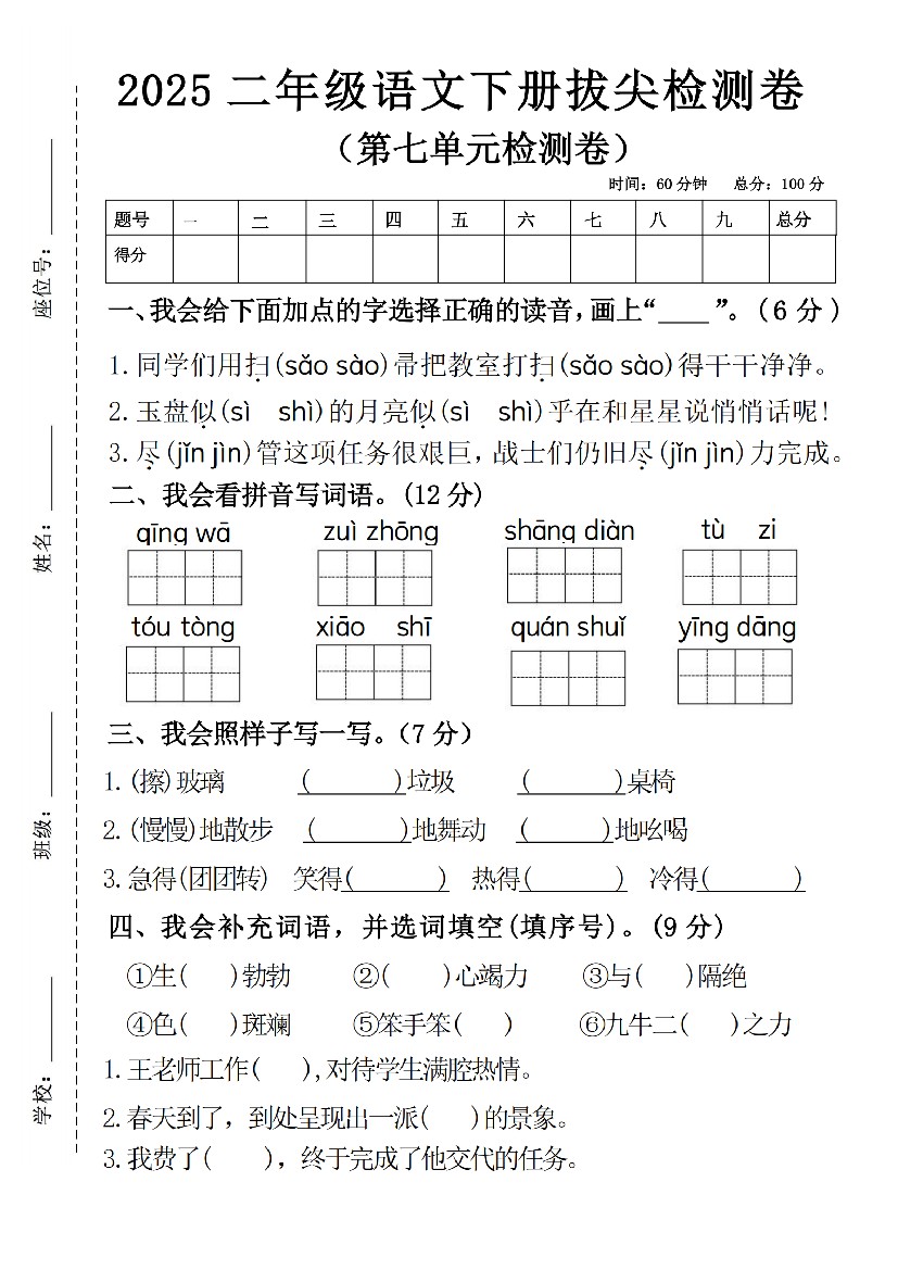 2570【25学年二下语文第七单元综合测评卷(含答案6页)
