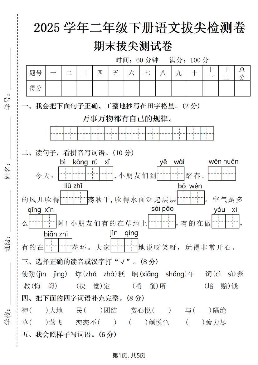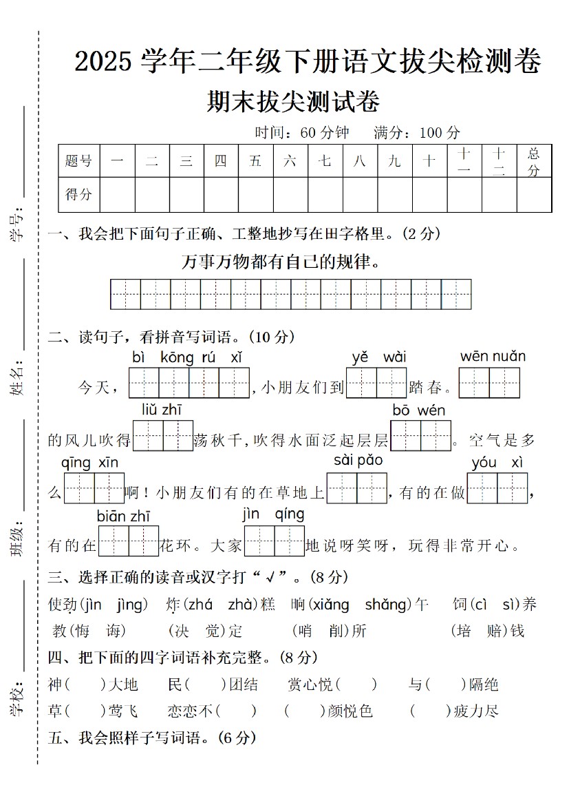 2025学年二年级下册语文期末测试卷-万事-m