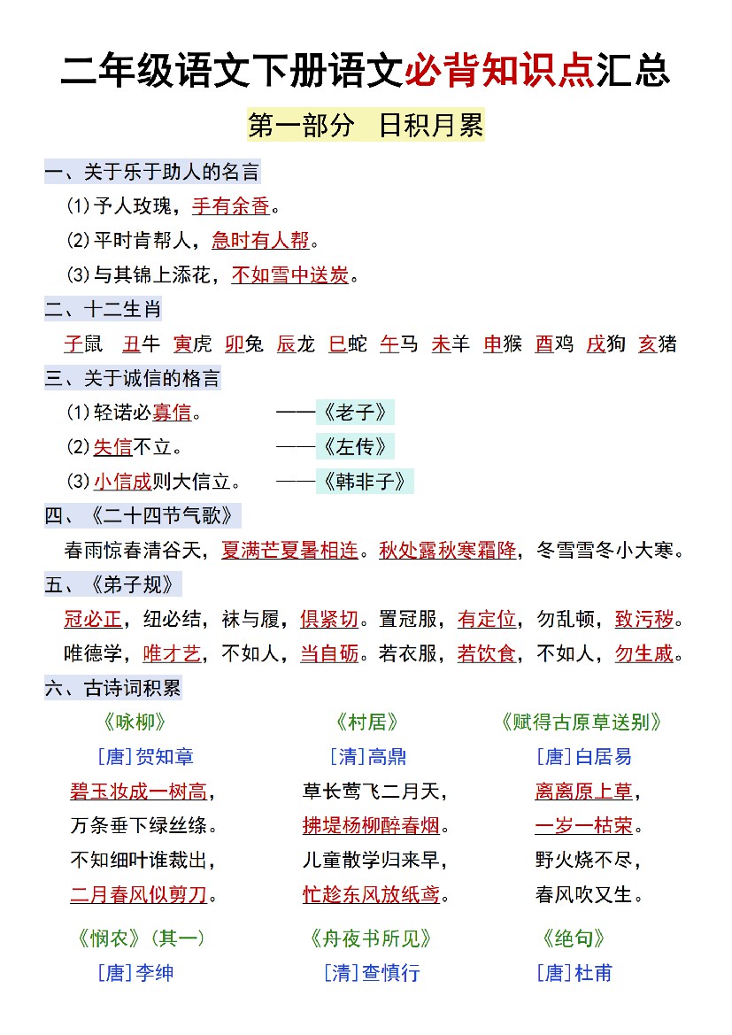 二年级语文下册语文必背知识点汇总