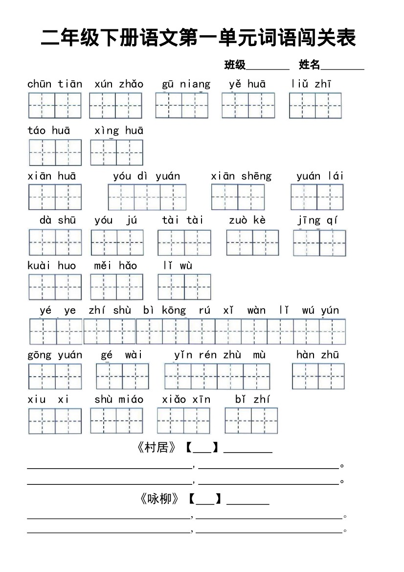 二年级(下)语文1-8单元词语闯关表