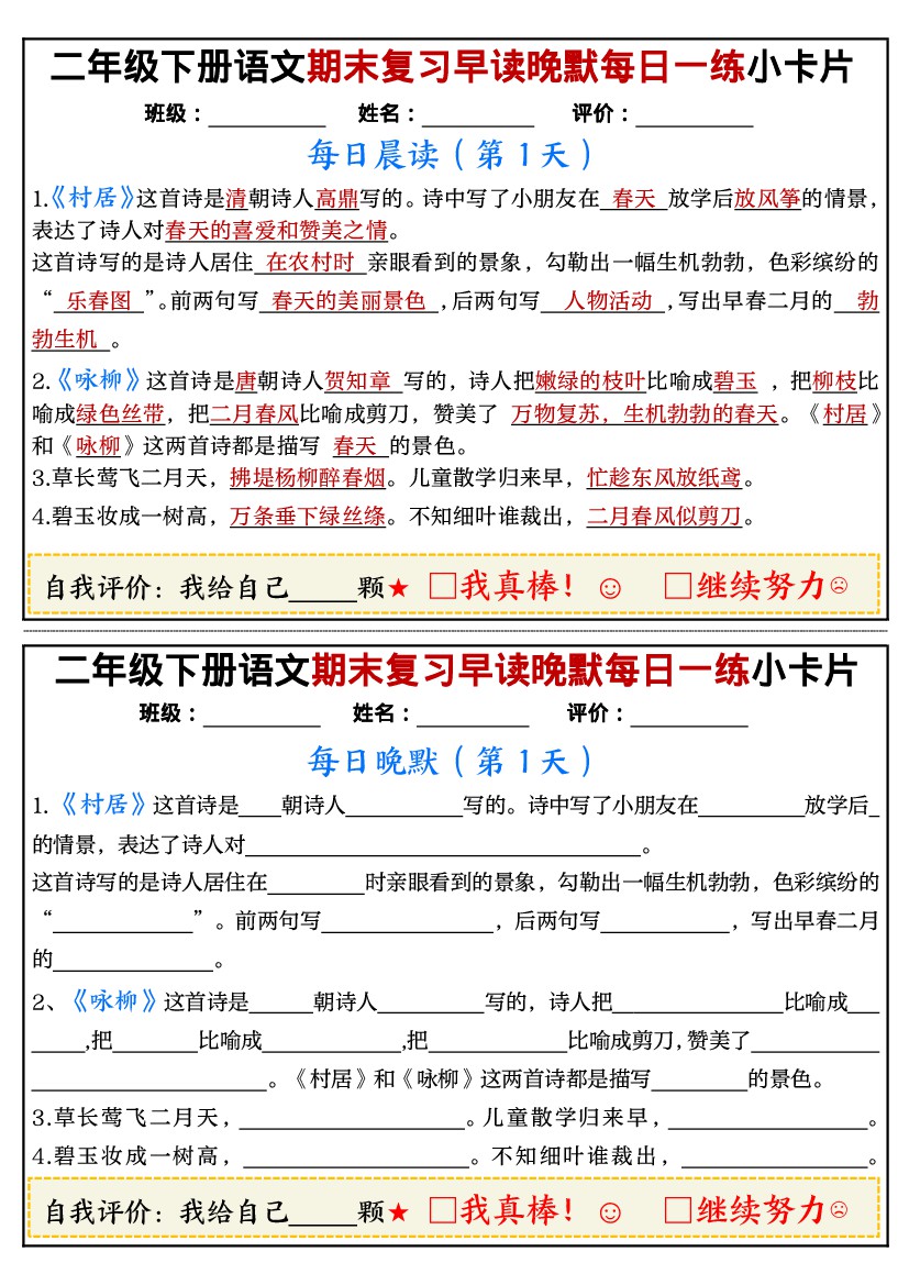 二年级(下)语文期末复习早读晚默每日一练小卡片