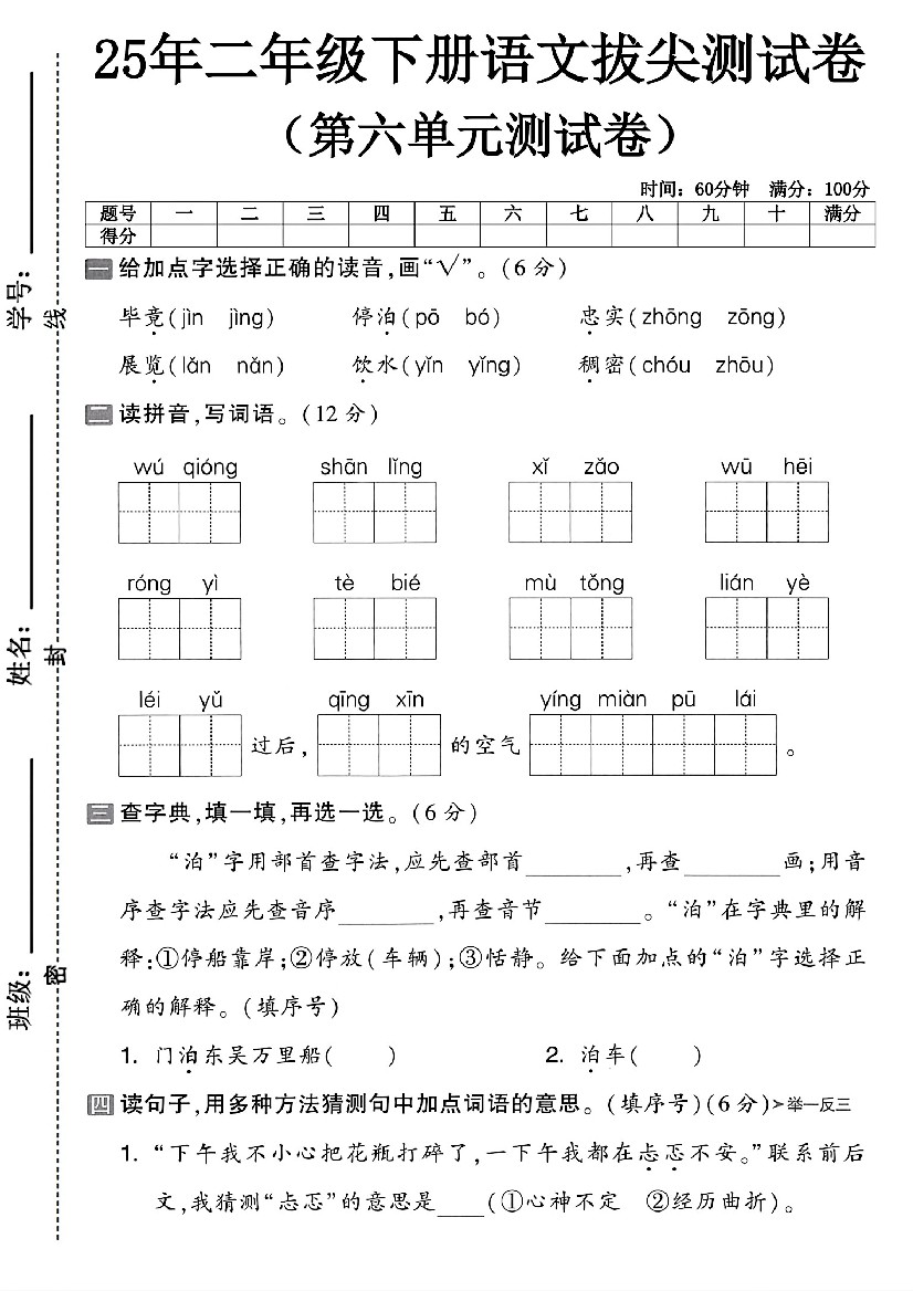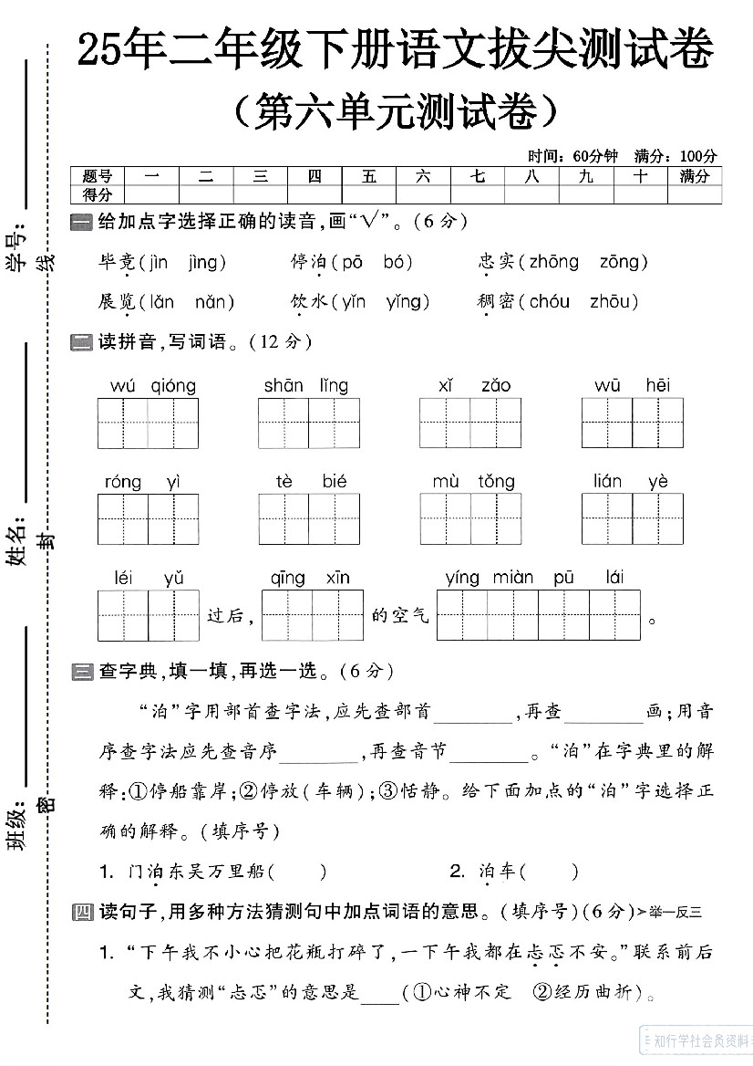 二年级(下)语文第六单元拔尖测试卷-毕竟(5页)