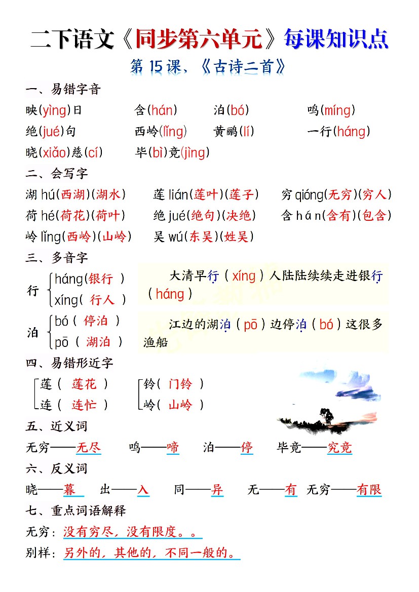 二年级(下)语文《第六单元》每课知识点清单