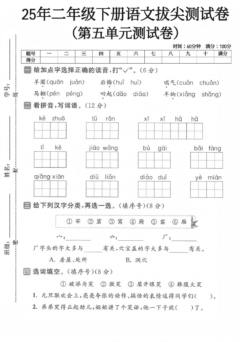 二年级(下)语文第五单元拔尖检测卷-羊圈
