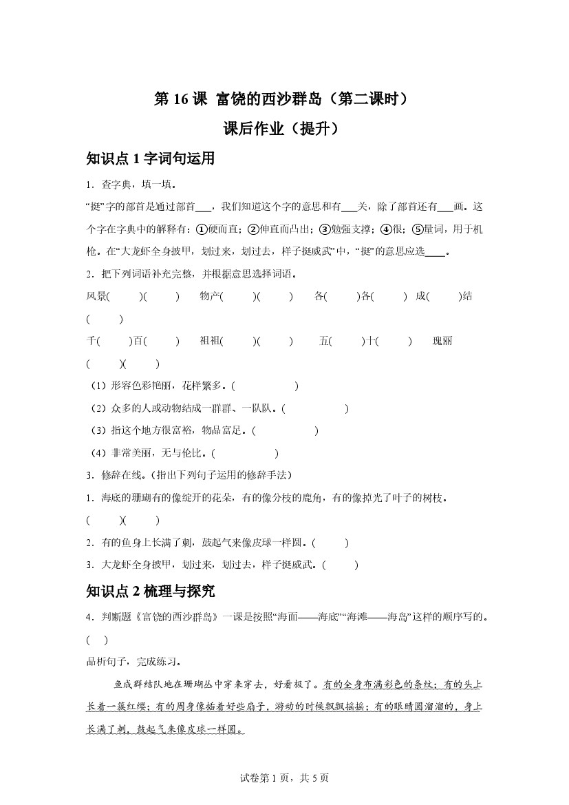 25年秋【三上语文】第16课 富饶的西沙群岛(第二课时)课后作业(提升)