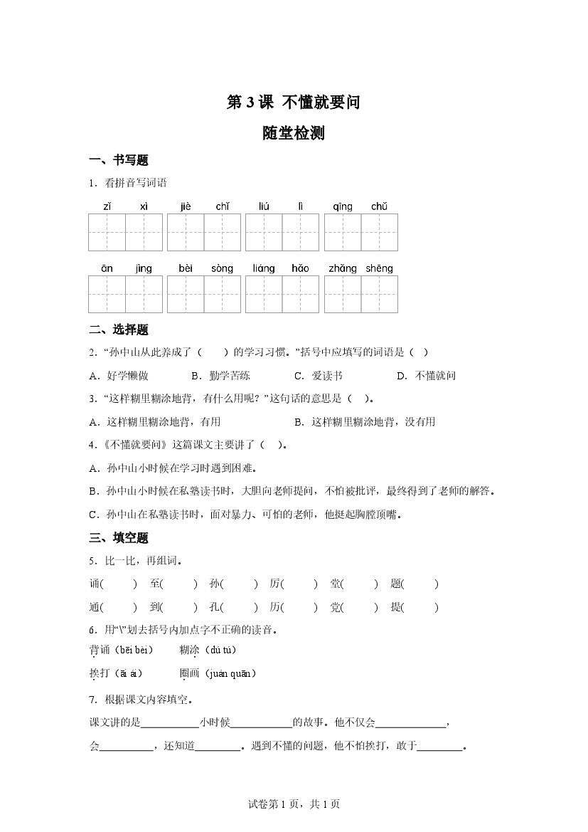 25年秋【三上语文】第3课 不懂就要问随堂检测