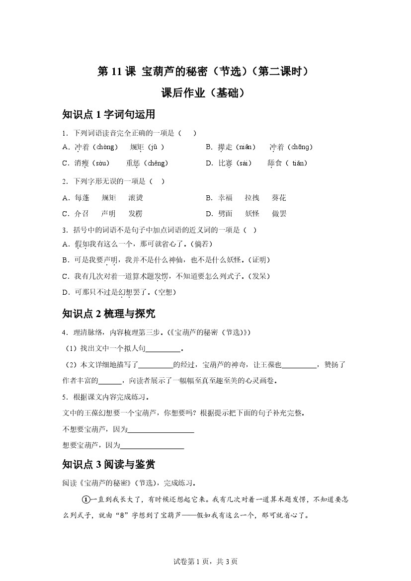 25年秋【三上语文】第11课 宝葫芦的秘密(节选)(第二课时)课后作业(提升)