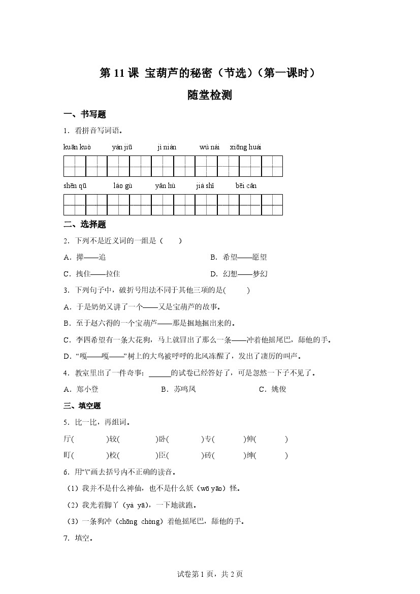 25年秋【三上语文】第11课 宝葫芦的秘密(节选)(第一课时)随堂检测