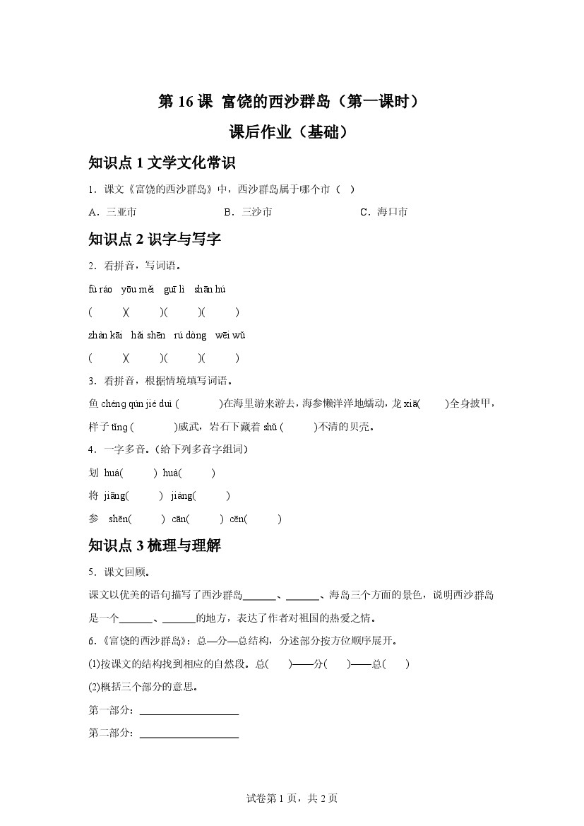 25年秋【三上语文】第16课 富饶的西沙群岛(第一课时)课后作业(基础)