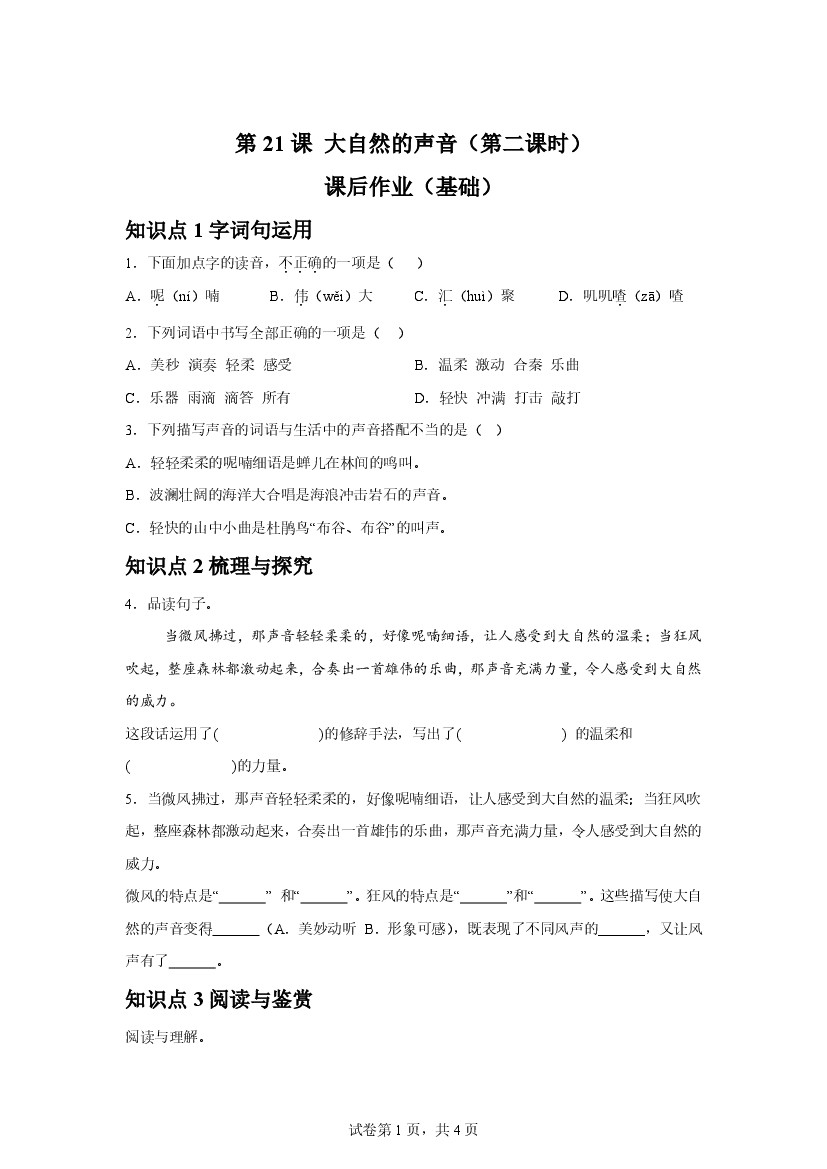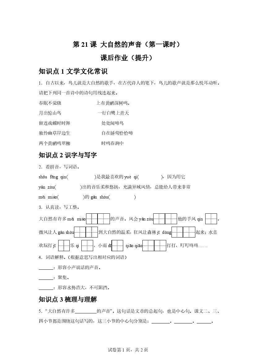 25年秋【三上语文】第21课 大自然的声音(第一课时)课后作业(提升)