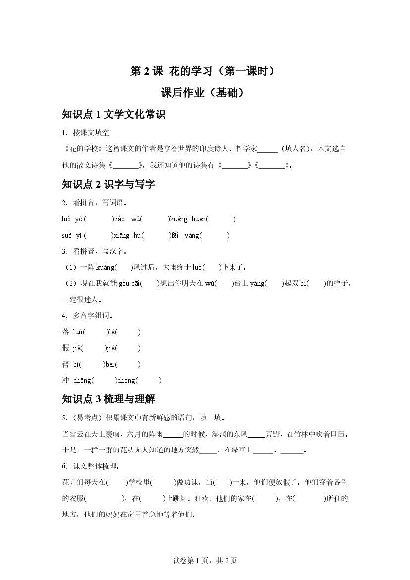 25年秋【三上语文】第2课 花的学习(第一课时)课后作业(基础)