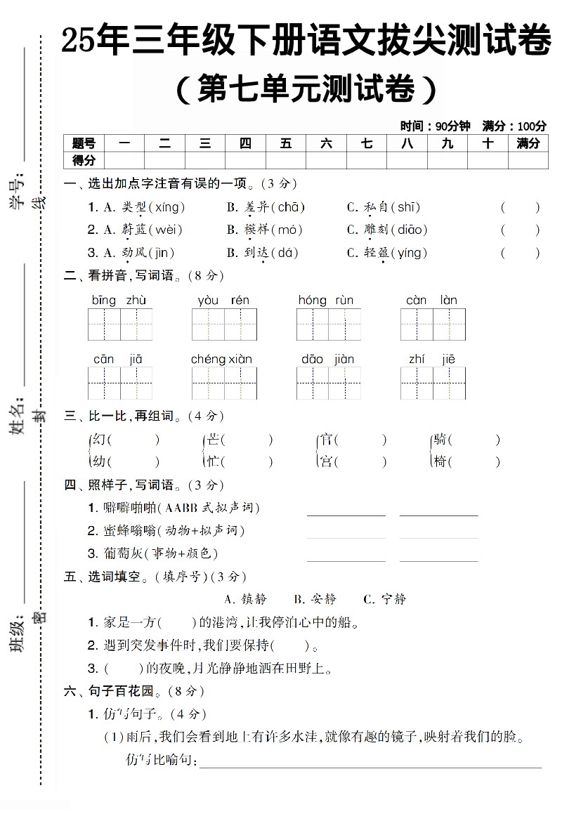 三下语文第七单元拔尖测试卷-类型(含答案5页)