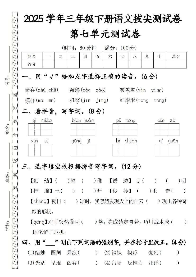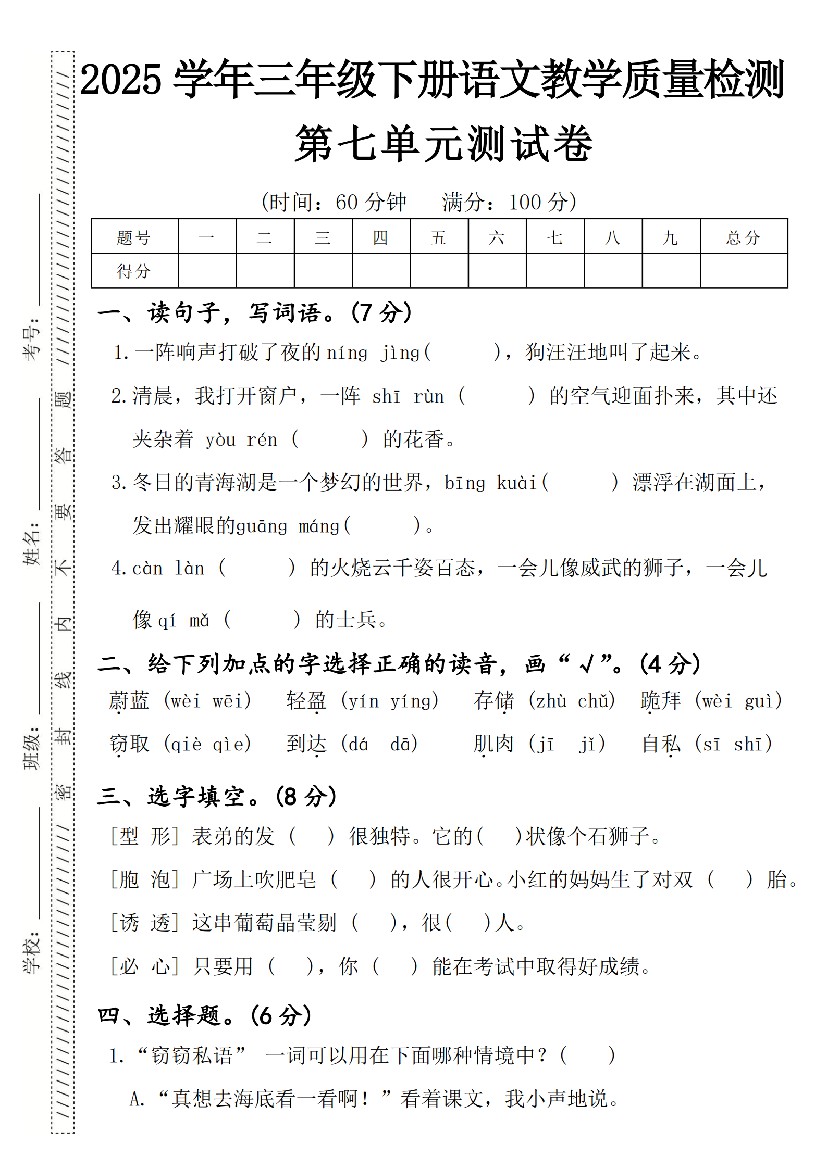 【试卷】【语文】三(下)语文自编第7单元基础复习卷(附答案)
