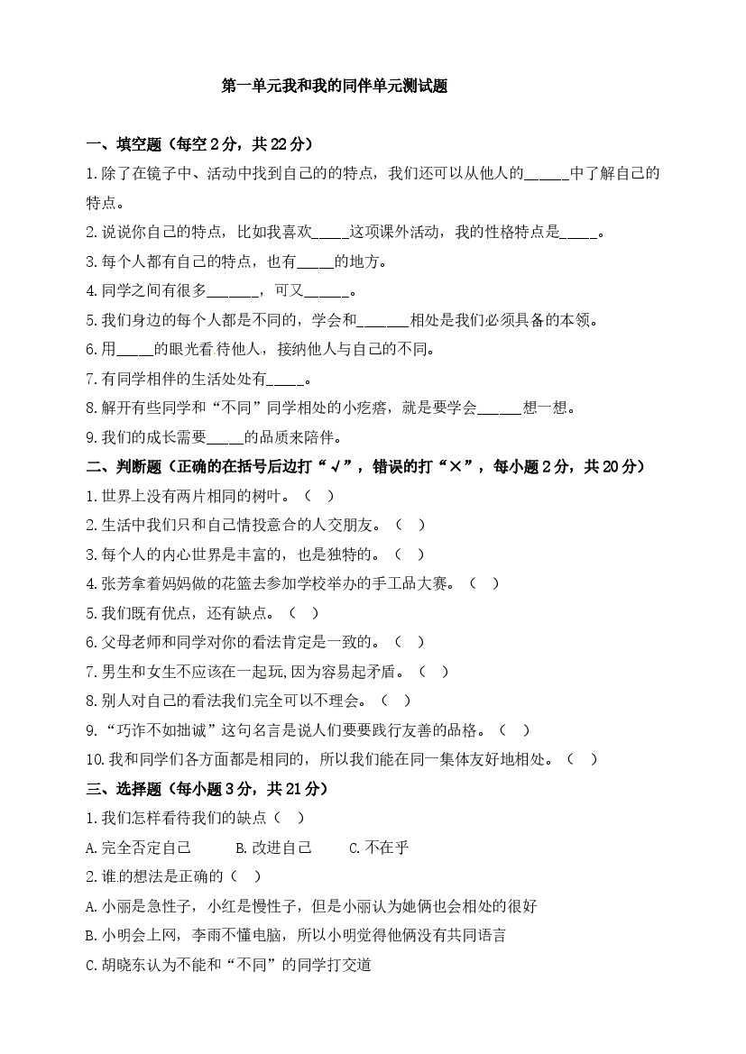 【精】第一单元我和我的同伴三年级下册道德与法治单元测试卷人教部编版(含答案)