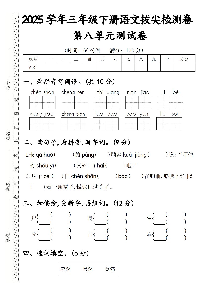 2025学年三年级下册语文拔尖检测卷第八单元(衬衫)-m