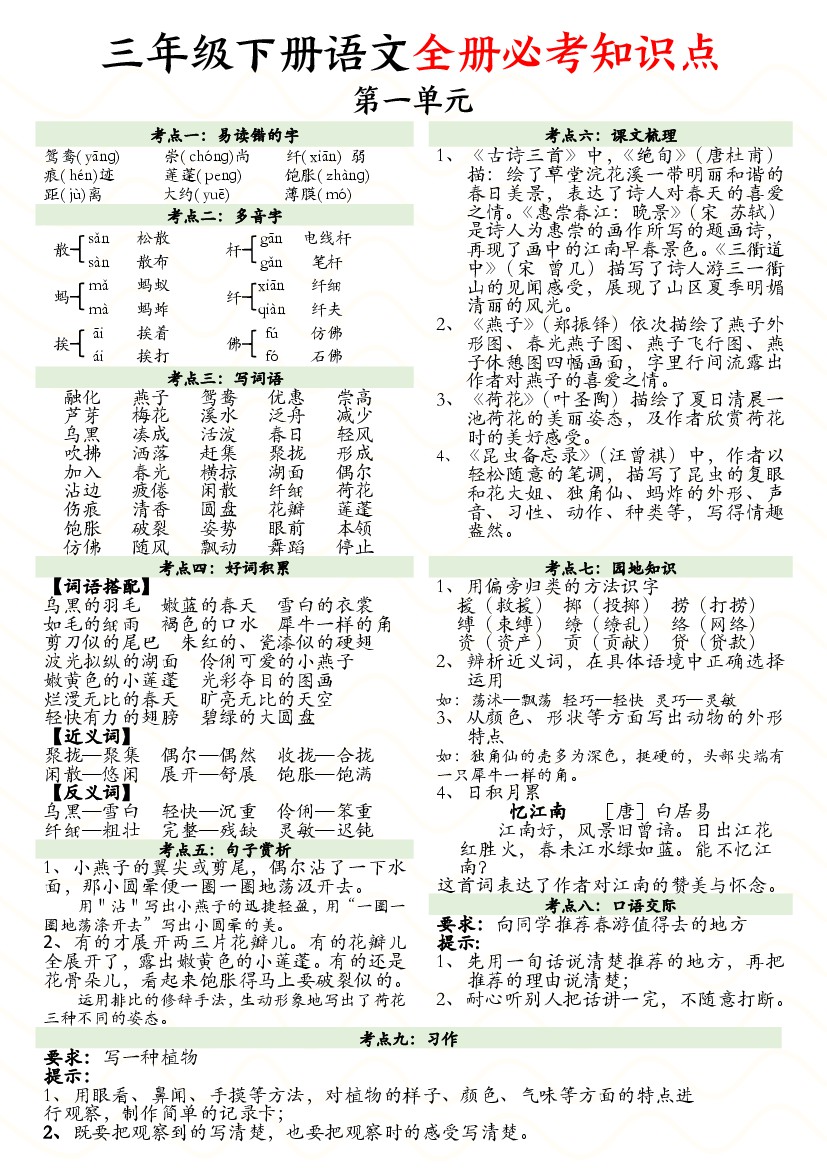 三年级(下)语文全册1-8单元必考知识点汇总(8页)