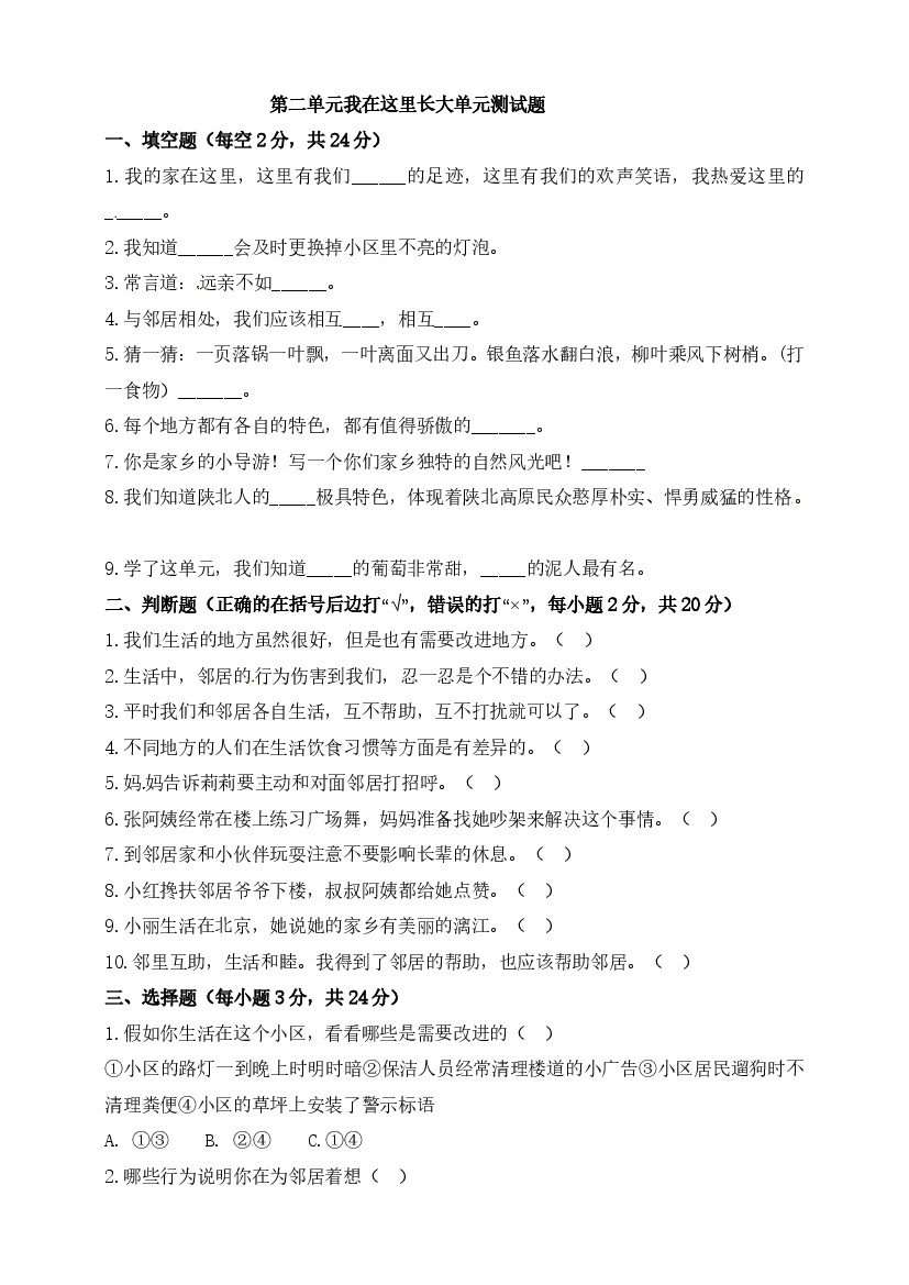 【精】第二单元我在这里长大三年级下册道德与法治单元测试卷人教部编版(含答案)