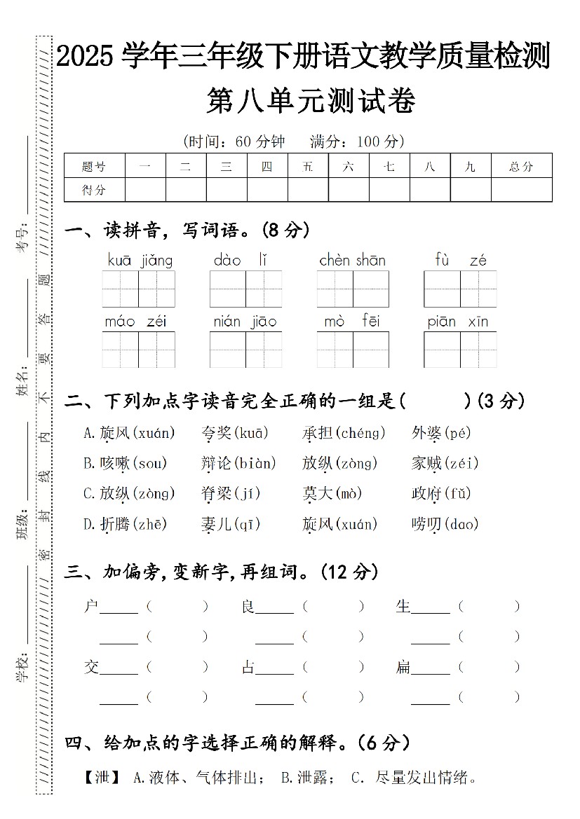 【试卷】【语文】三(下)语文自编第8单元基础复习卷(附答案)