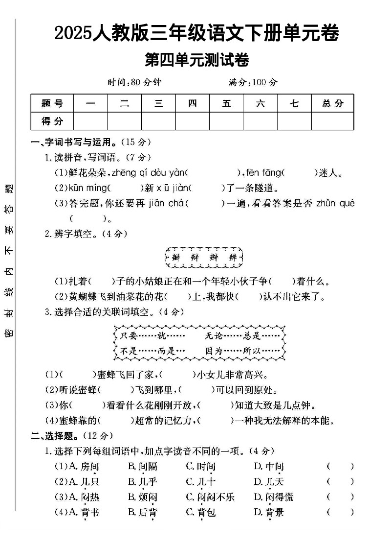 【试卷】【语文】三(下)语文自编第4单元基础复习卷(附答案)