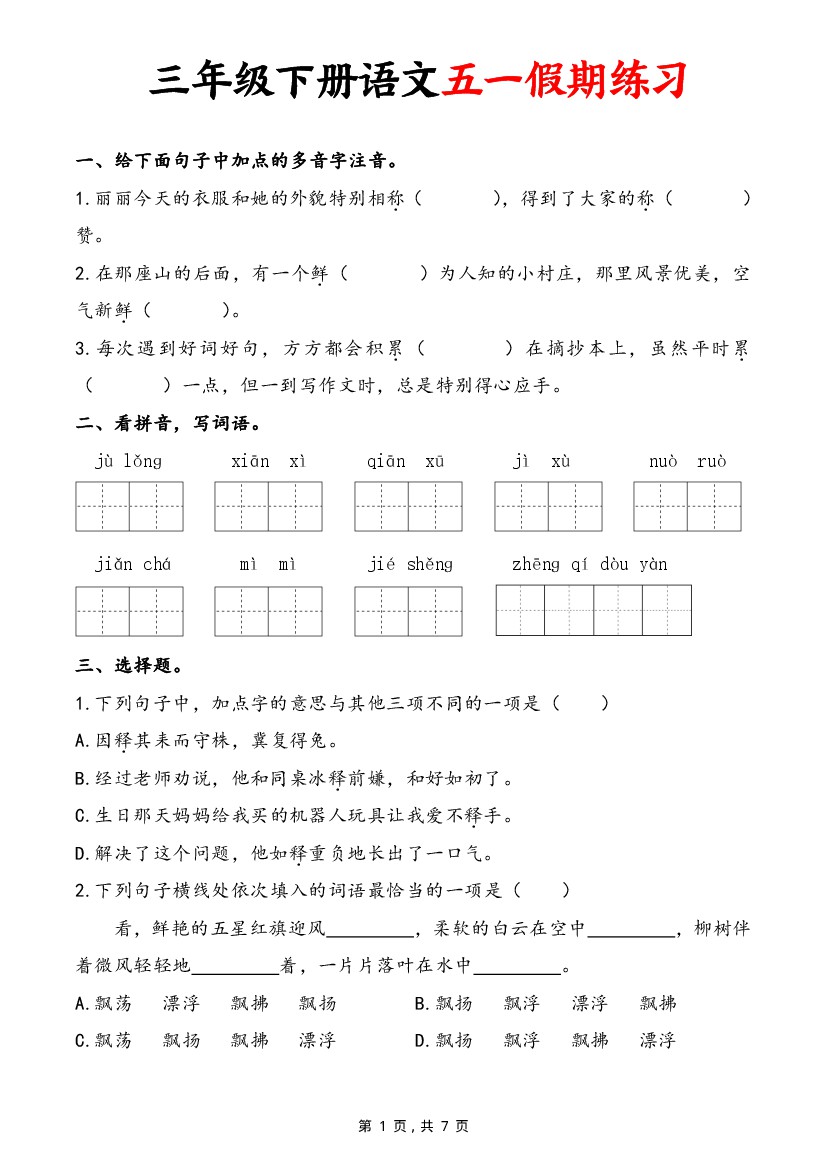 【试卷】【语文】三(下)语文自编第1单元基础复习卷(附答案)