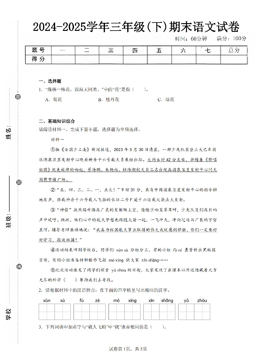 【2025学年情境化试题(期末真题情景卷一)】三下语文_ 秋风劲吹