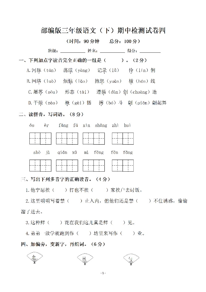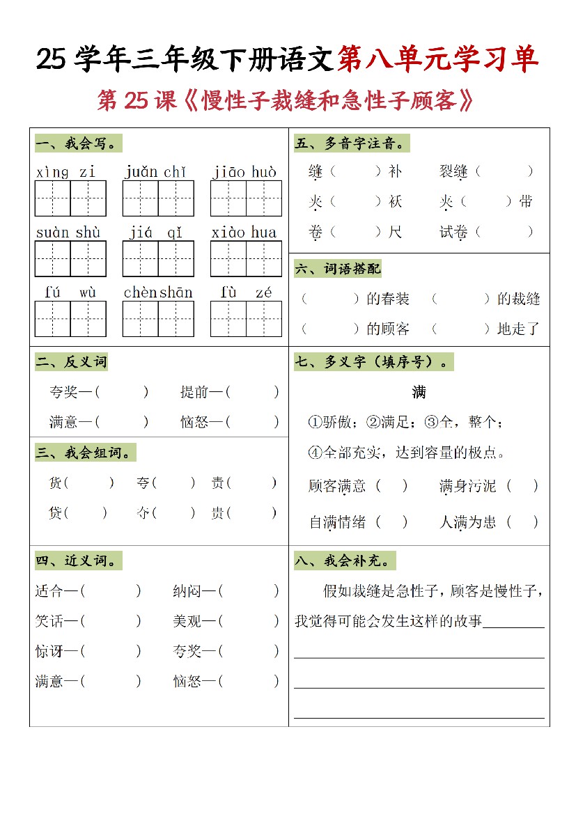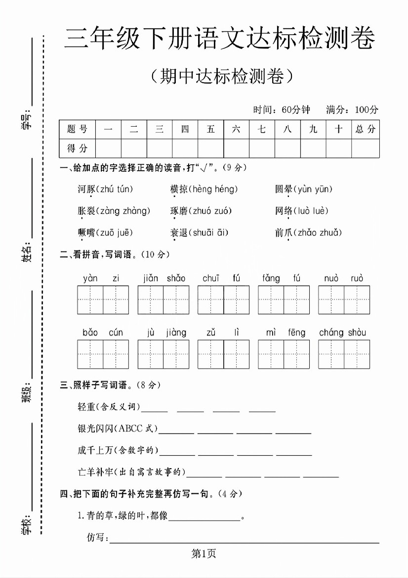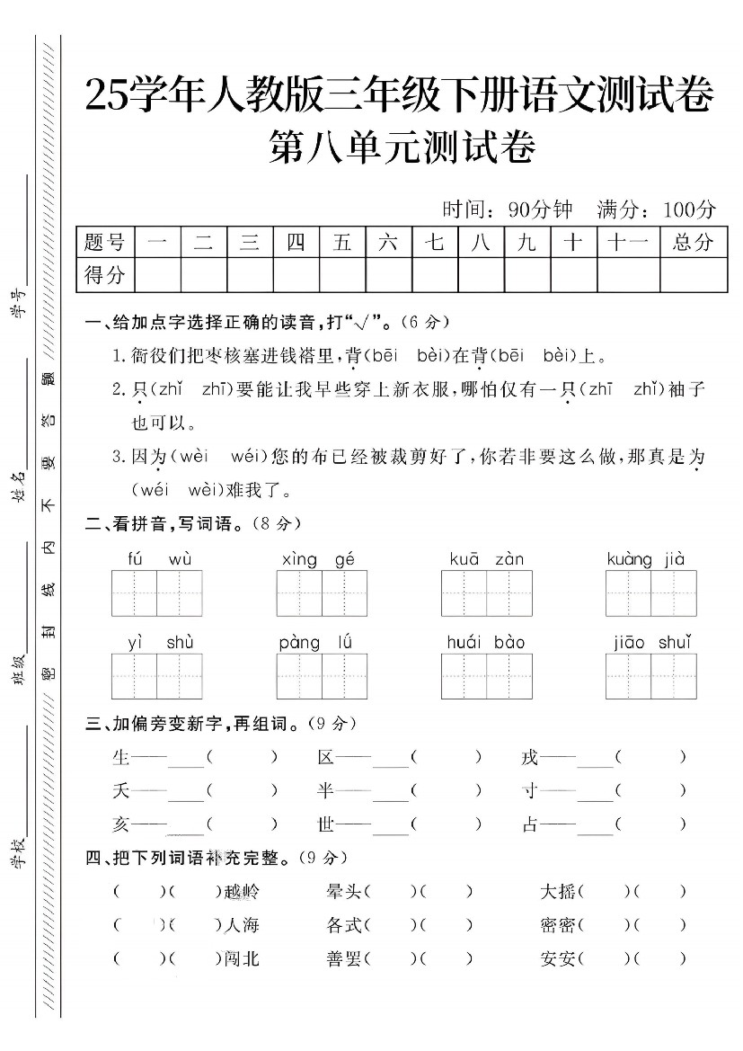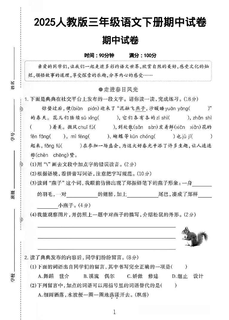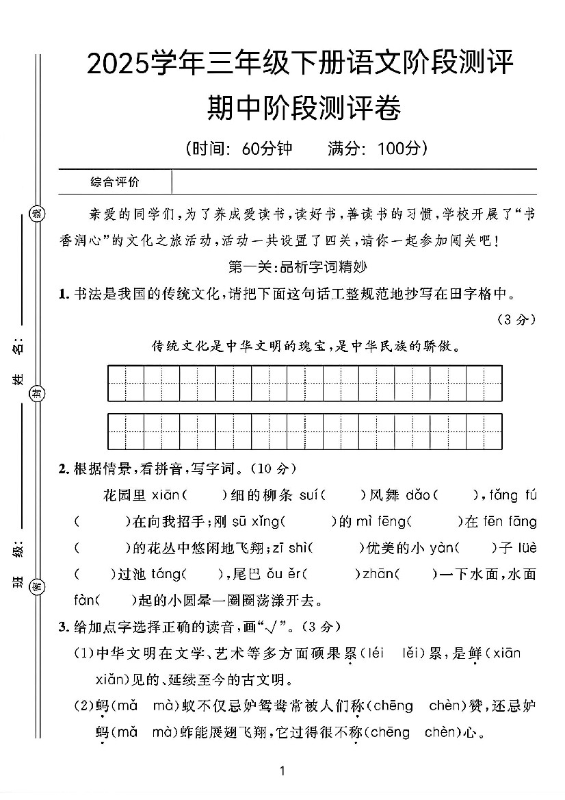 25春三年级下册语文期中阶段测评卷(含答案8页)