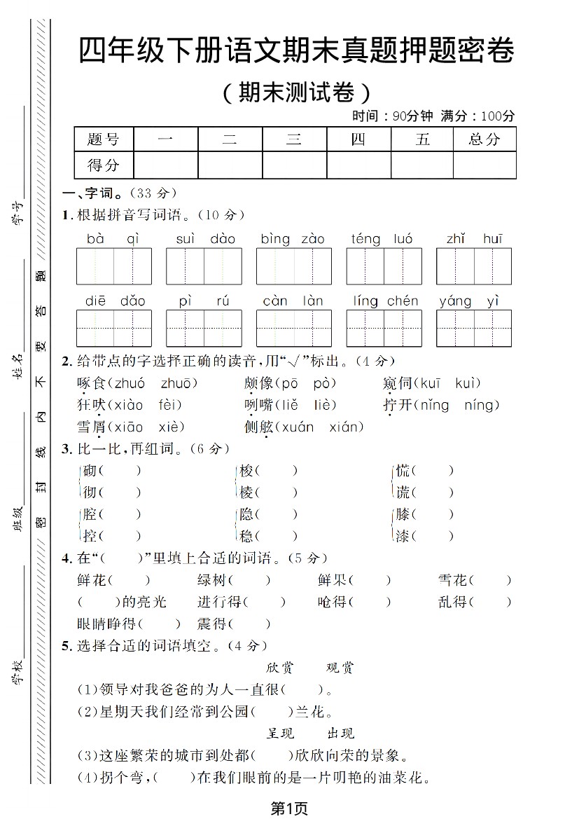 四年级(下)语文期末真题押题密卷