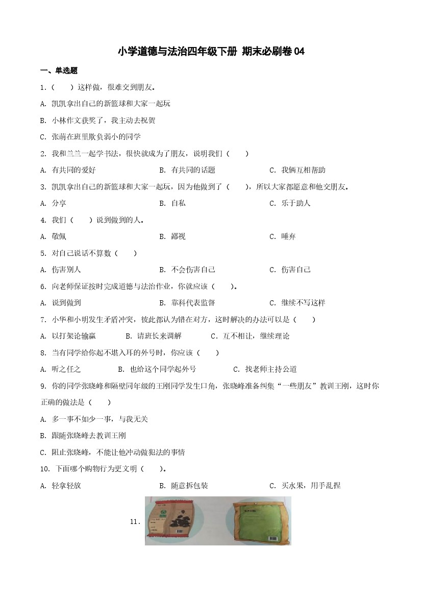 小学道德与法治四年级下册期末必刷卷04