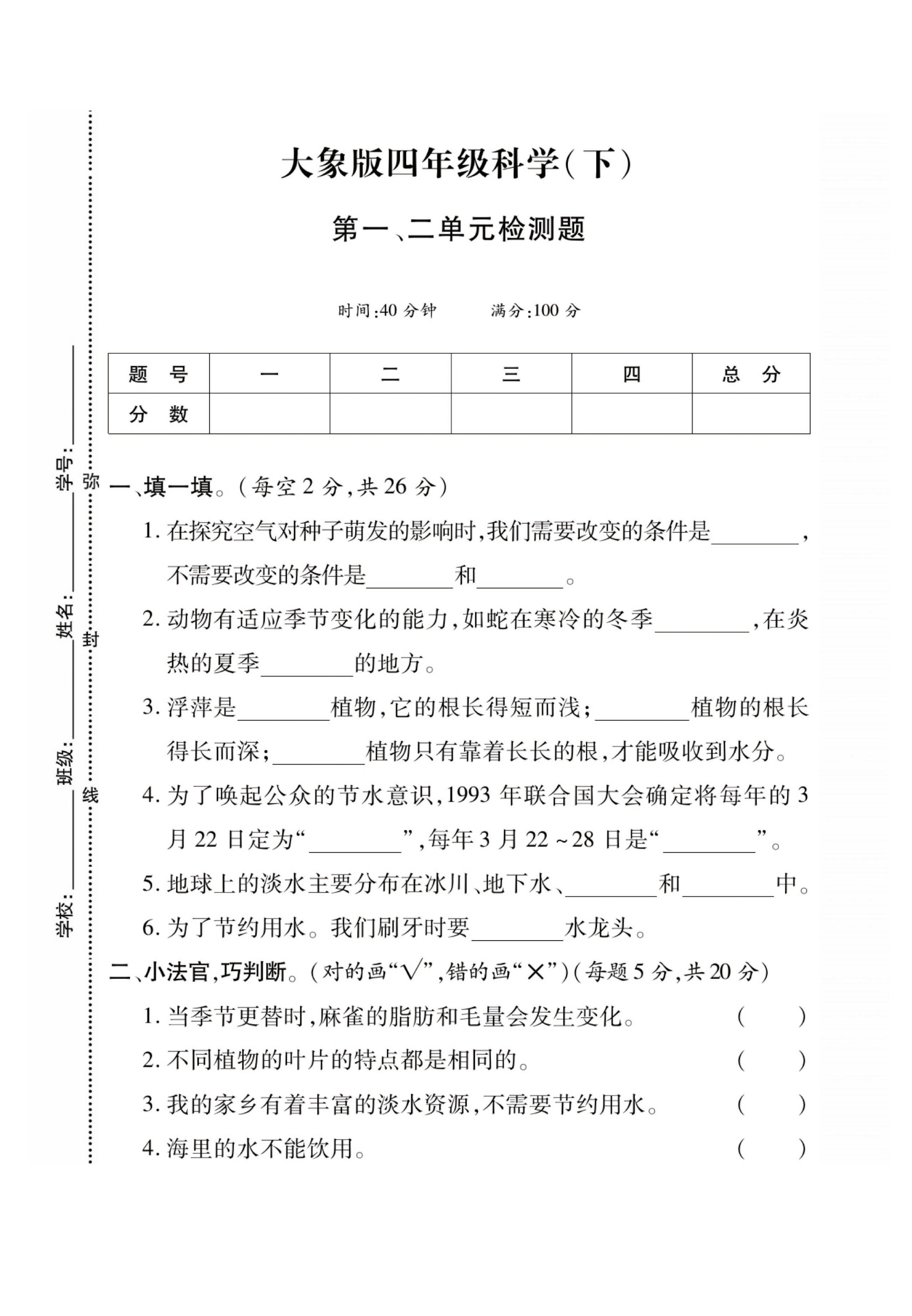 四年级(下)【大象版】科学单元+期中期末检测