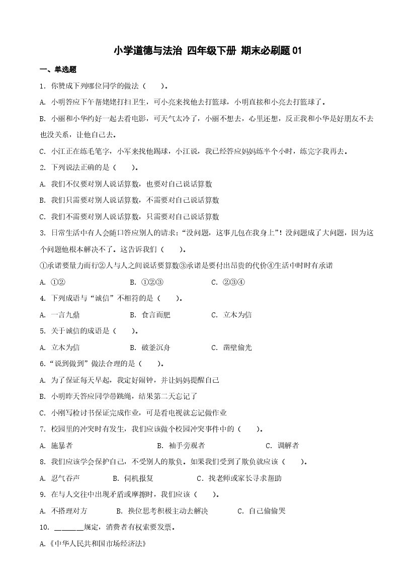 小学道德与法治四年级下册期末必刷卷01
