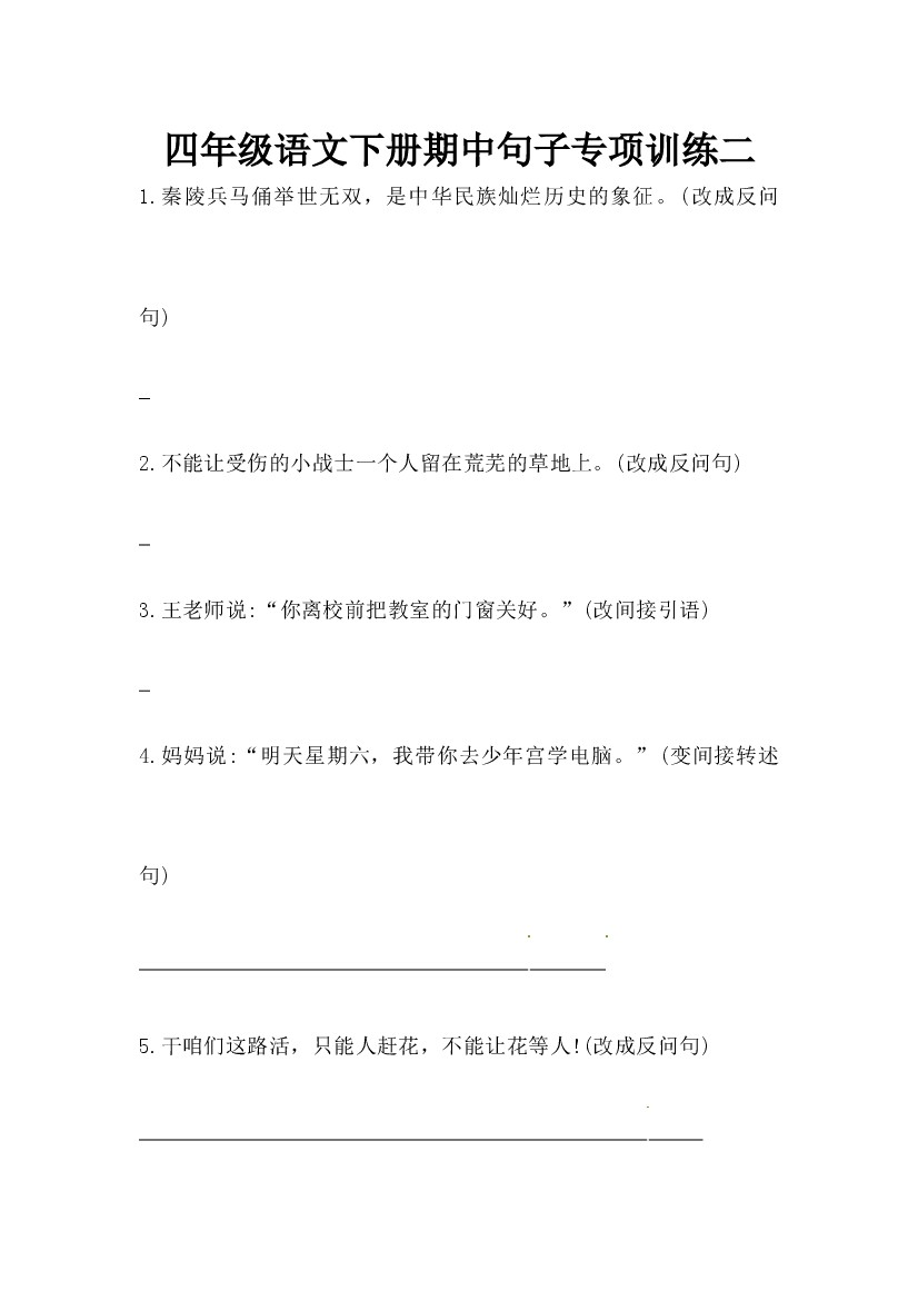 四年级语文下册期中句子专项训练二(人教部编版,含答案)