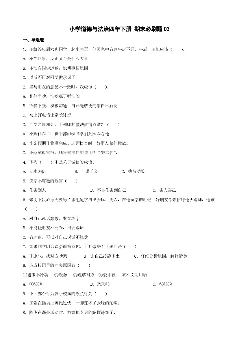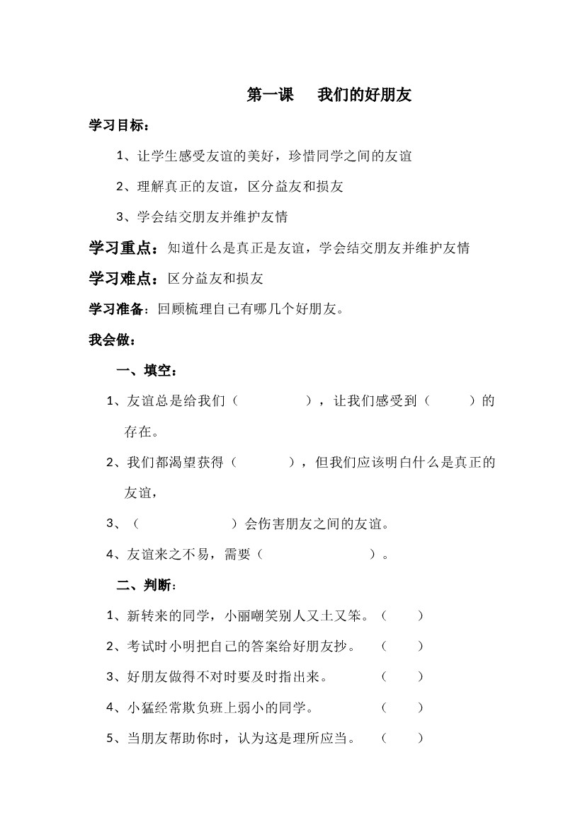 人教部编版四年级下册《道德与法治》第1课我们的好朋友-课课练含答案