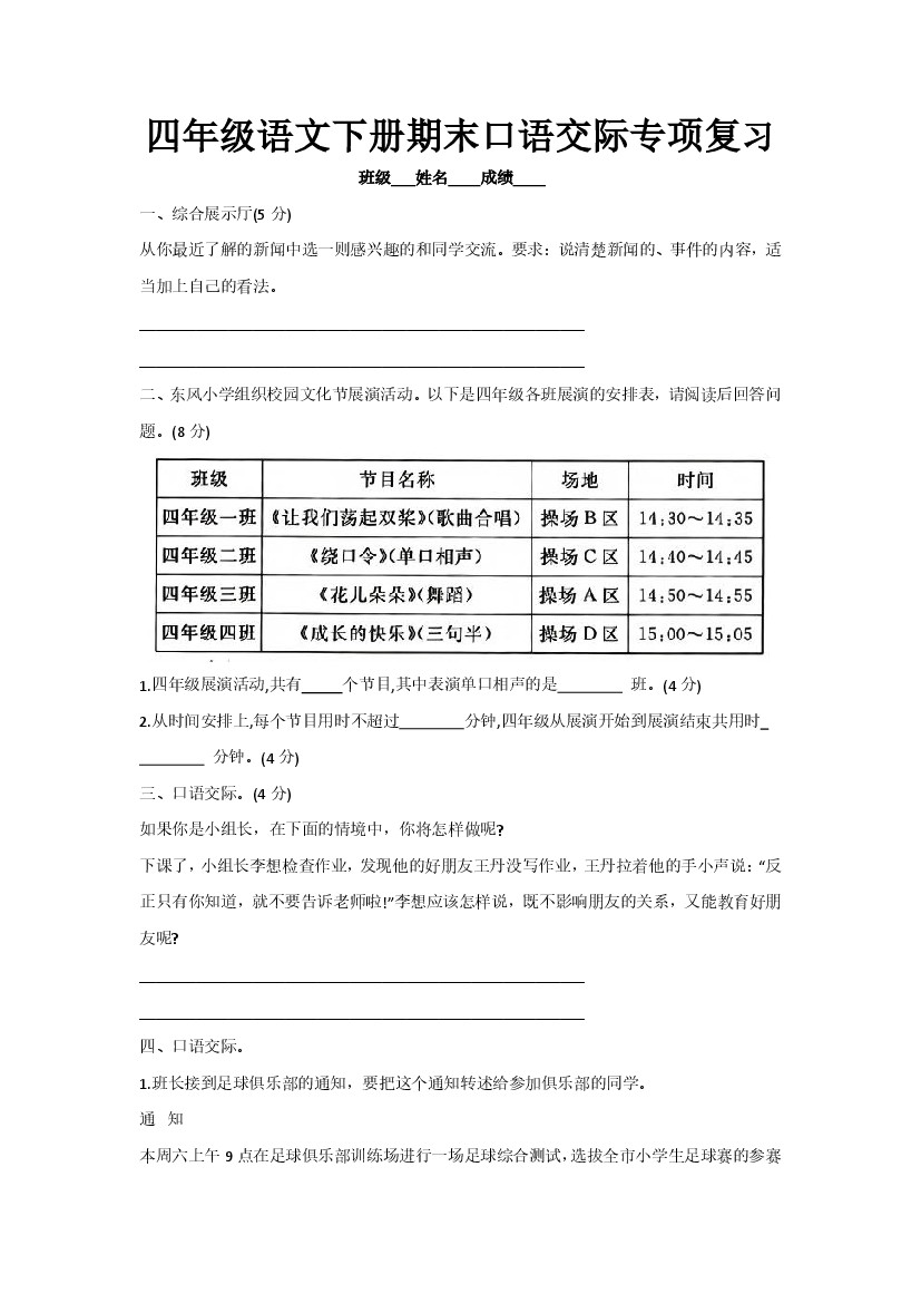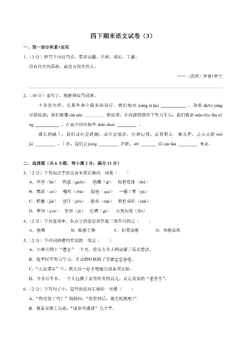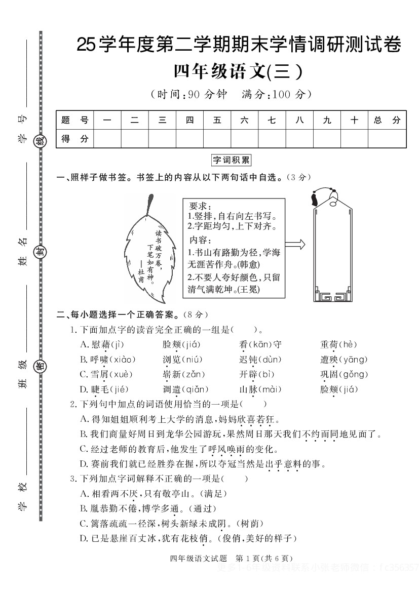 【四下语文】25学年度第二学期期末学情调研测试卷3