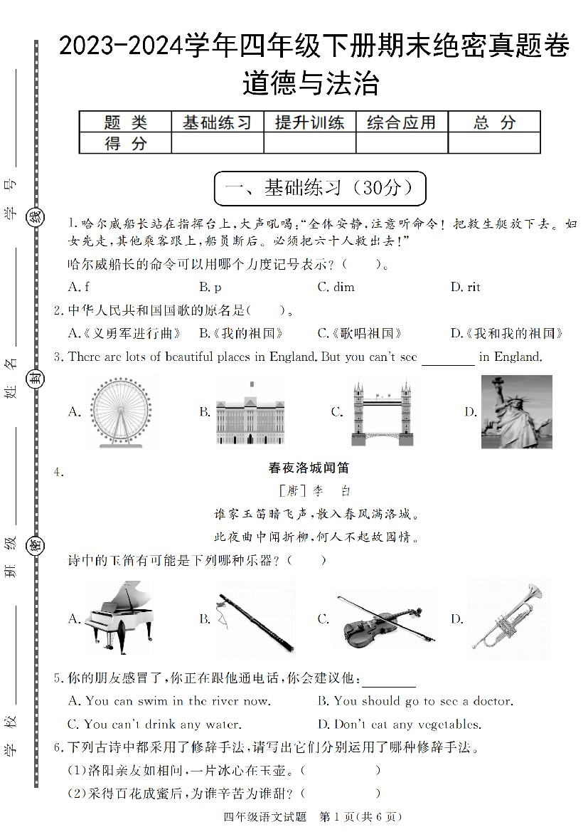 【期末真题模拟】四下语文25学年度第二学期期末测试卷1