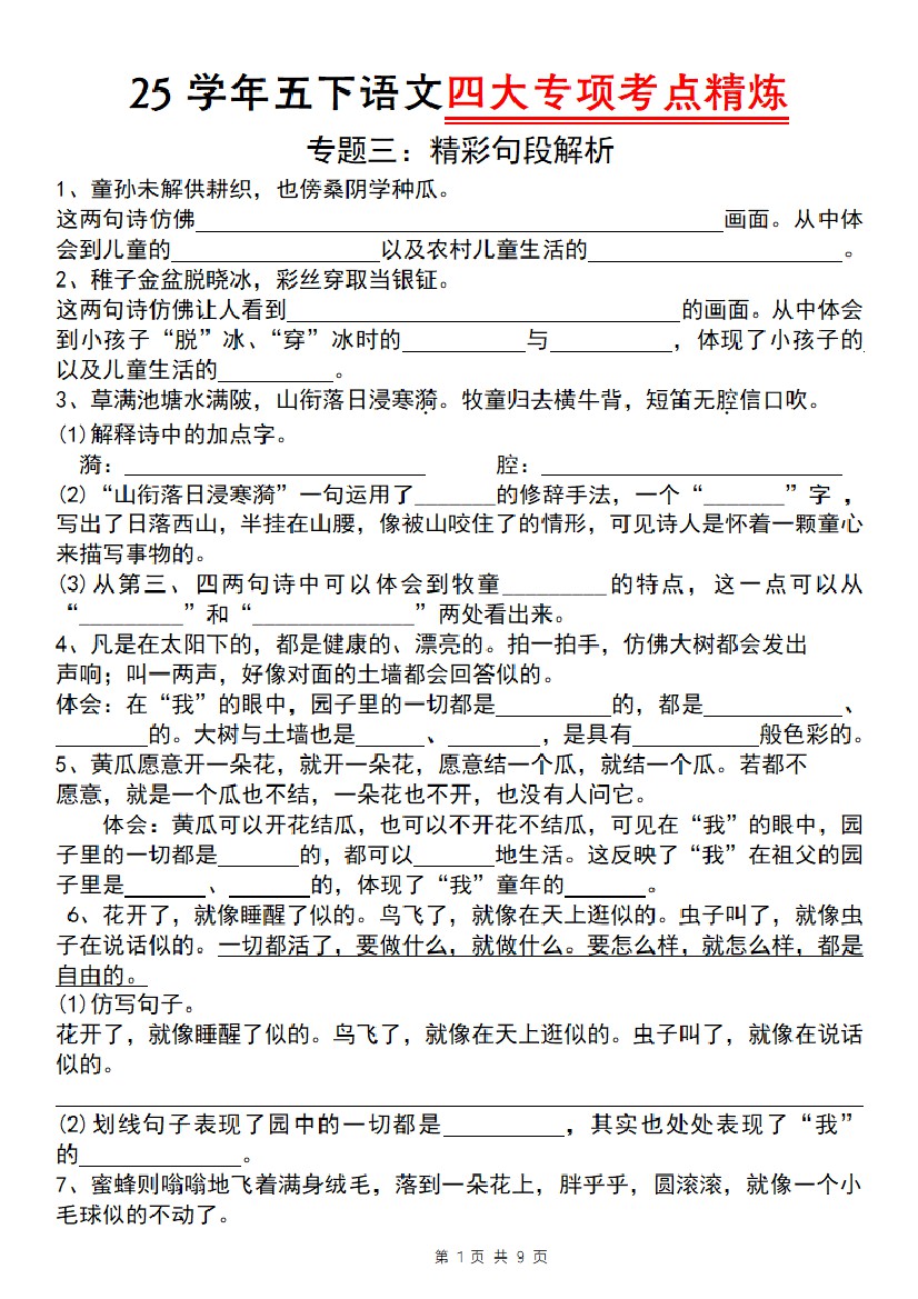 ❀25学年五下语文四大专项考点精炼(专题三:精彩句段解析)