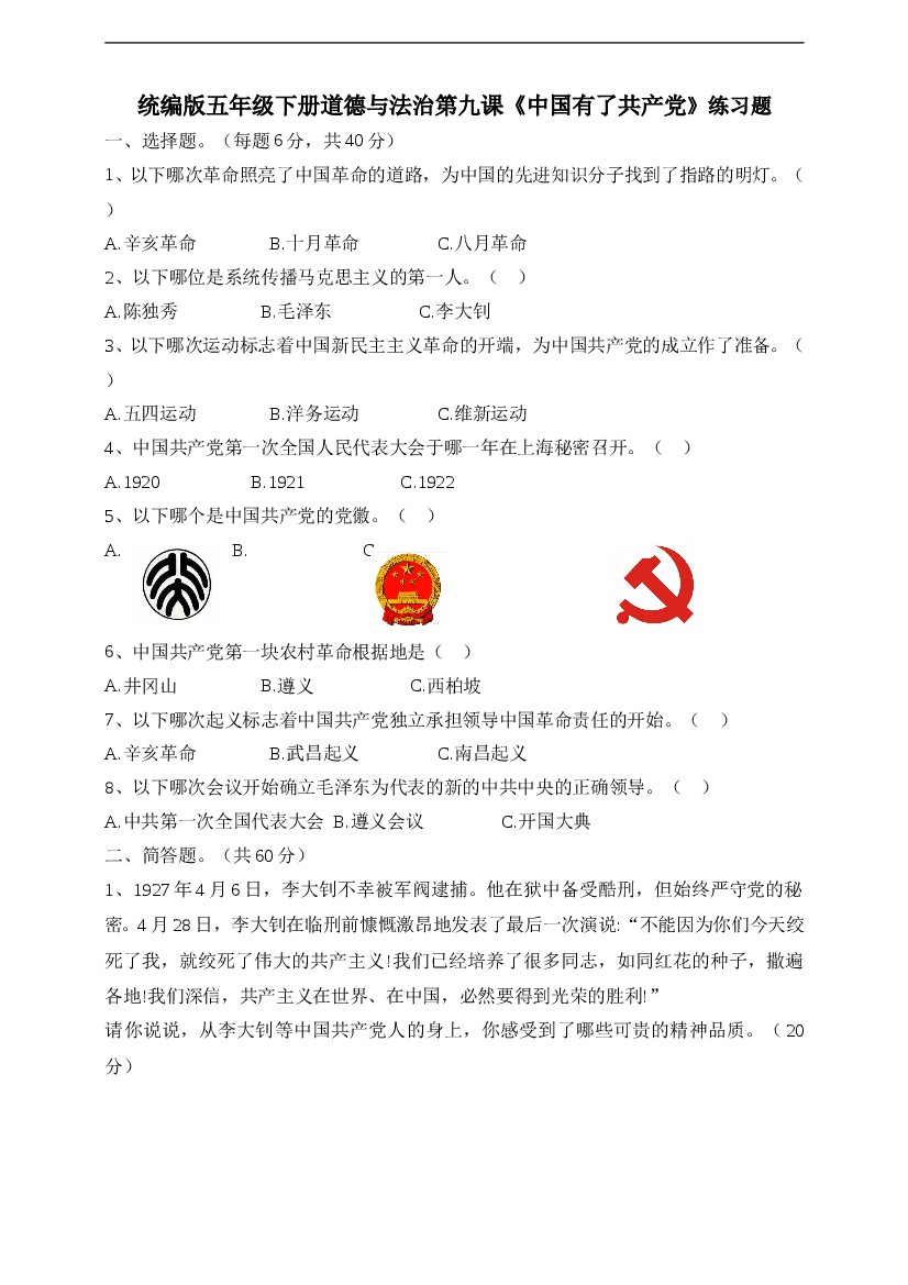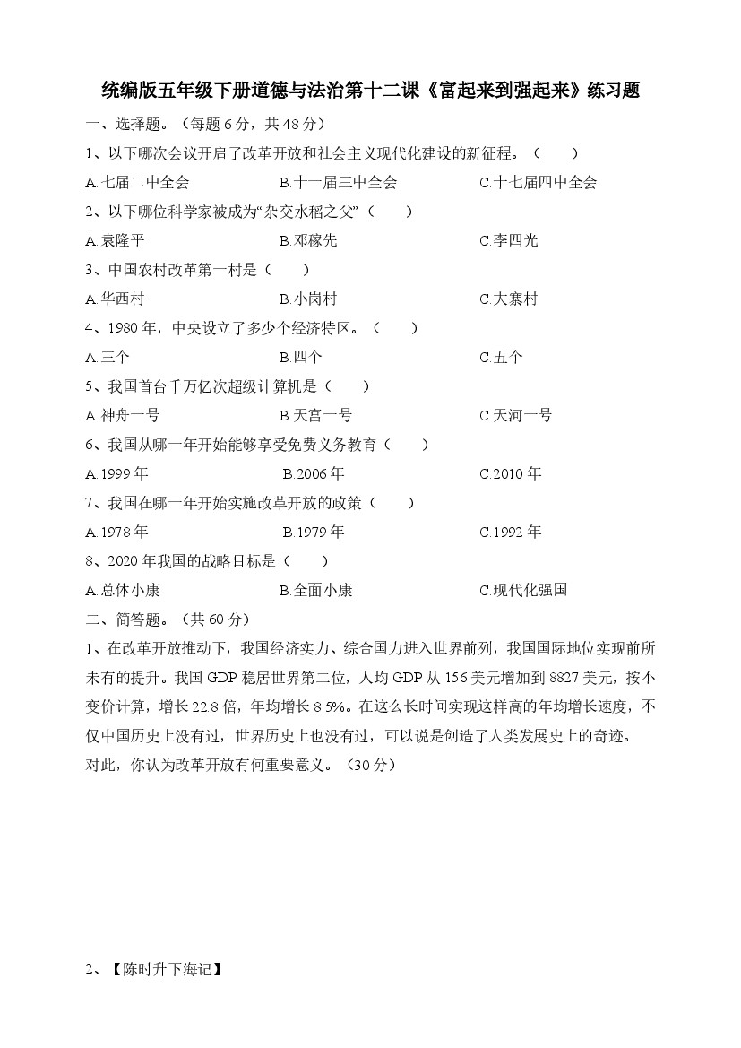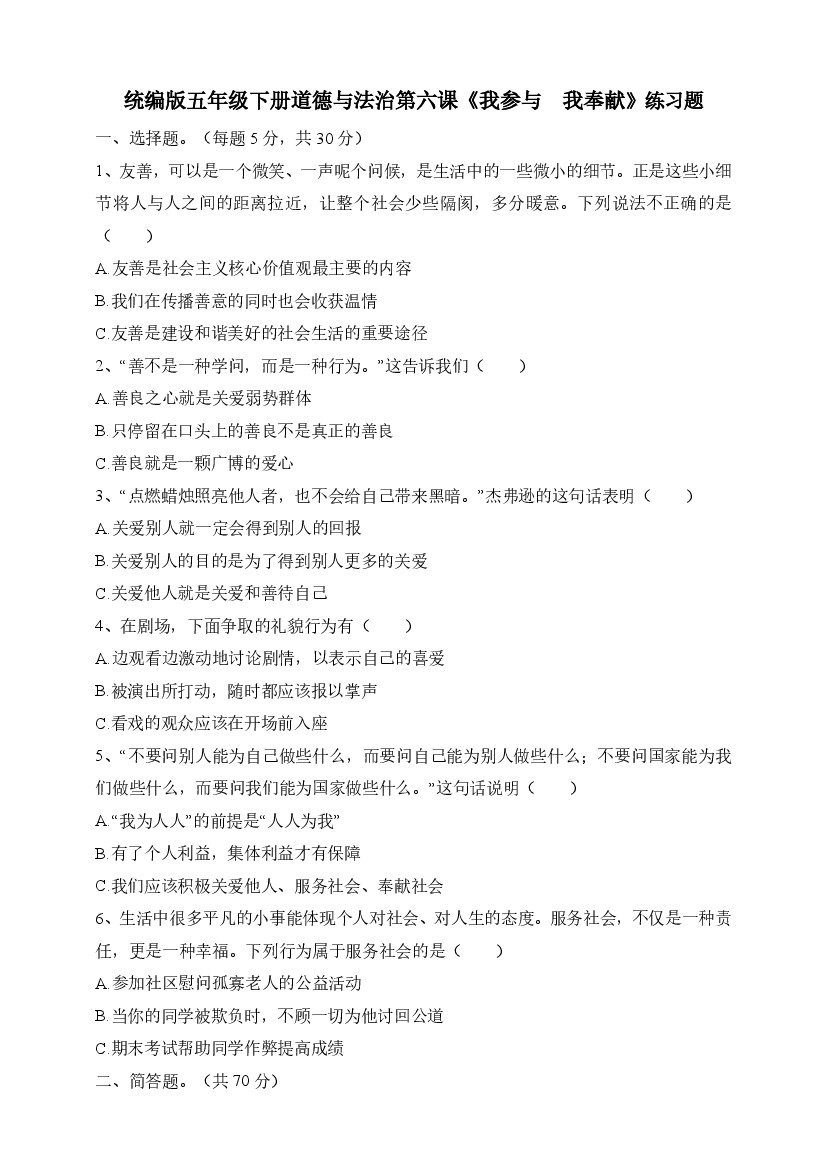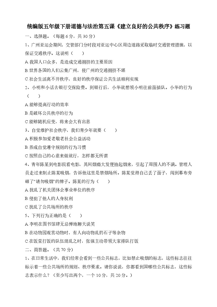 人教部编版道德与法治五年级下册期末综合测试卷含答案2