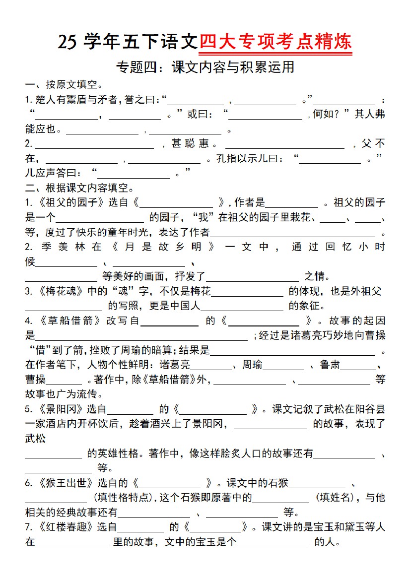 ❀25学年五下语文四大专项考点精(专题四:课文内容与积累运用)